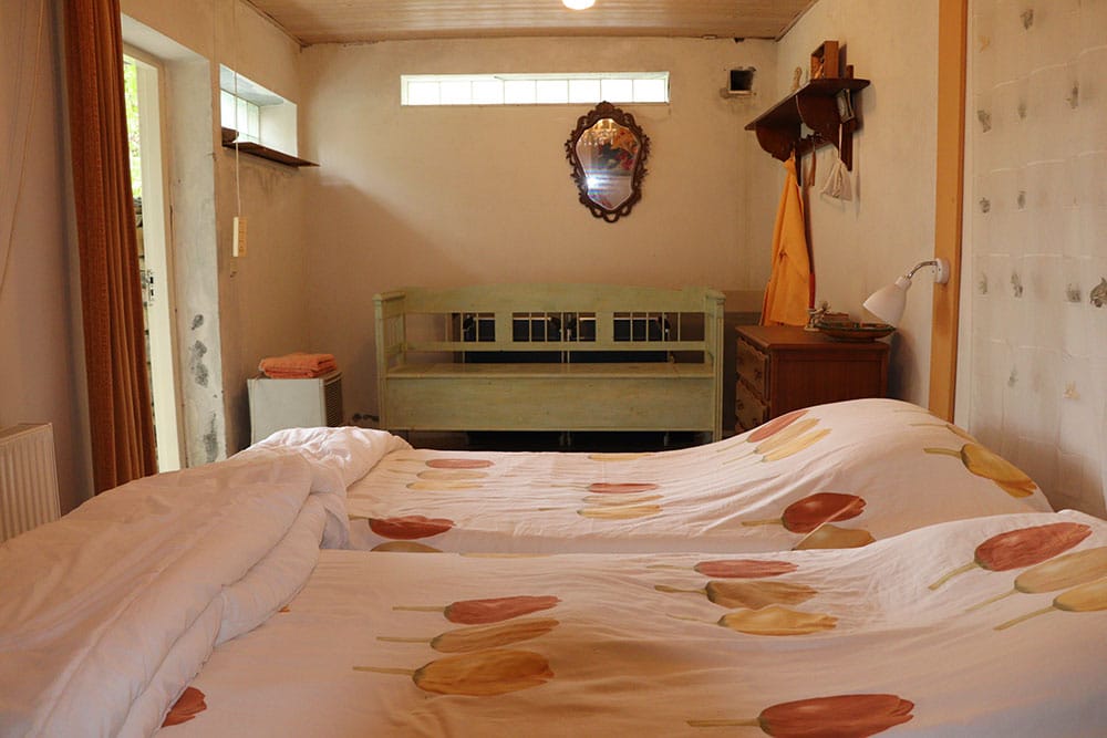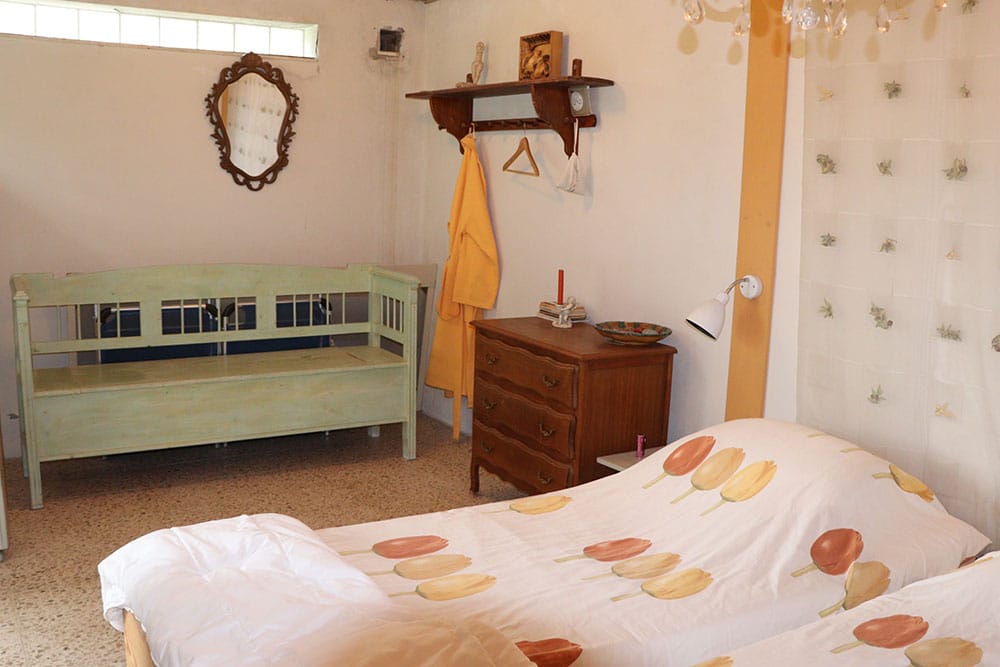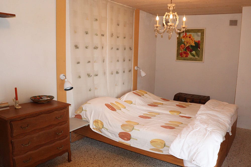 Adjacent to the kitchen is a small bedroom and next to it a spacious master bedroom. A large storage room is also accessible from the kitchen.