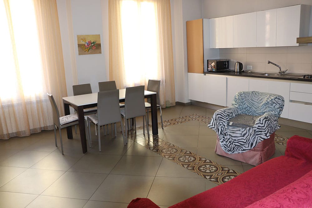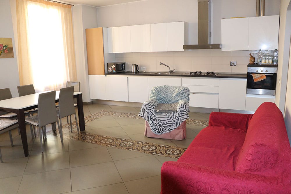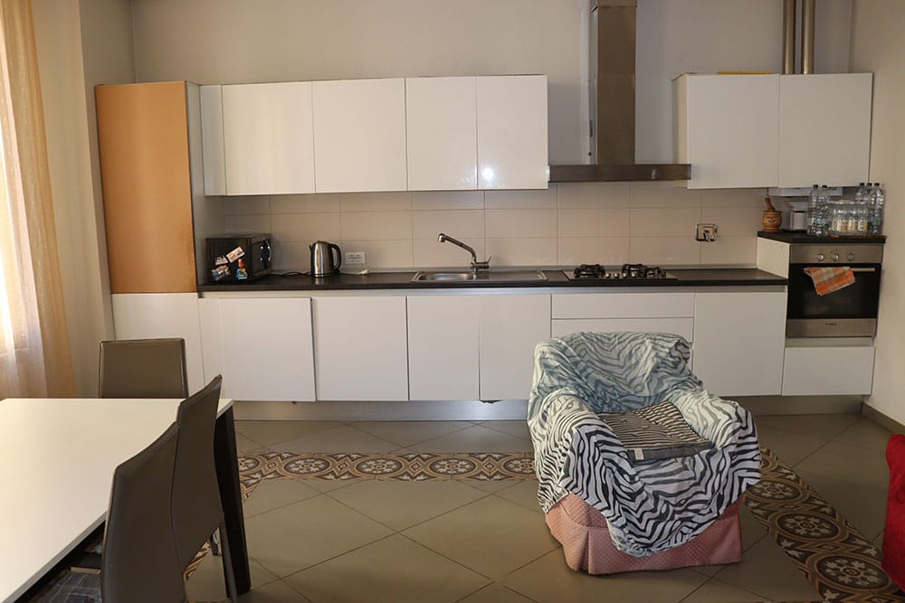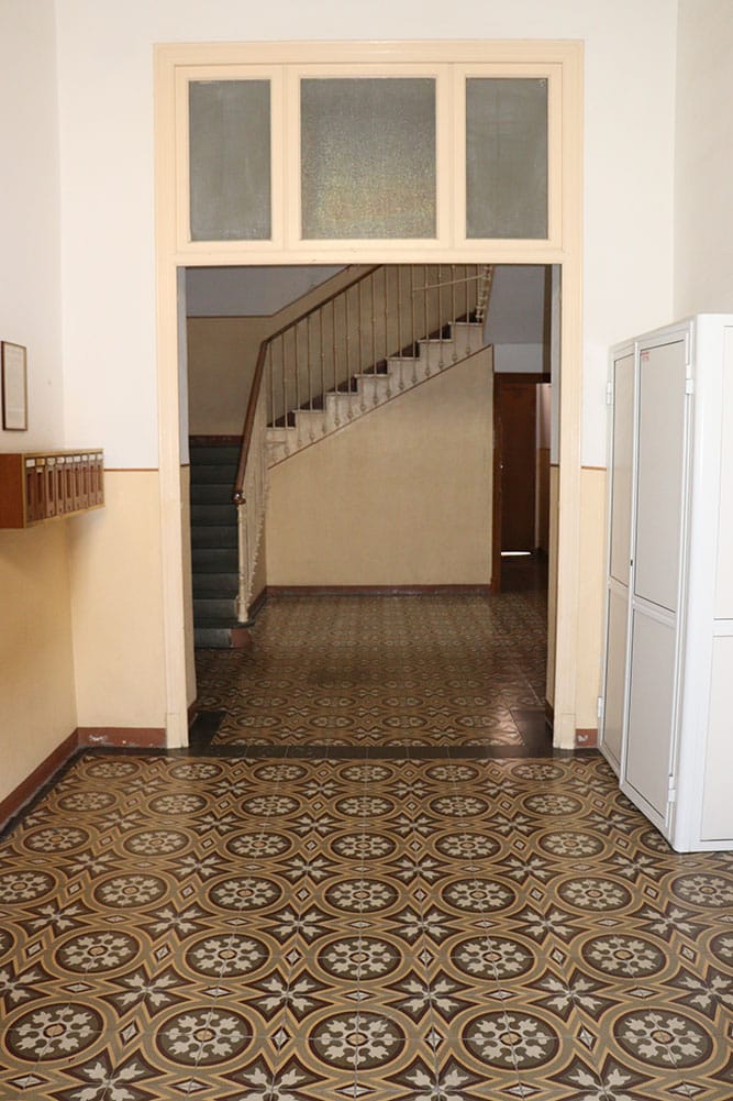 The flat has a spacious entrance hall, which leads to the large living room with open kitchen. The floor of the living room features a special detail that recalls the historic atmosphere of the building.